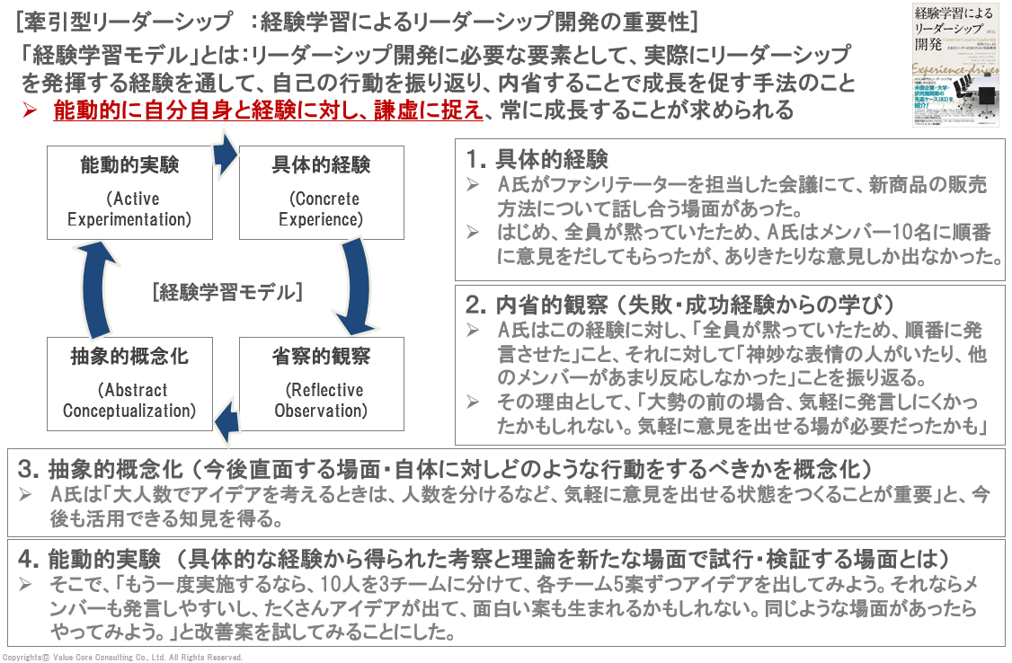 リーダーとして成長するには、「現場での挑戦経験(具体的経験)」と、「内省・対話」をセットにすることが不可欠です。