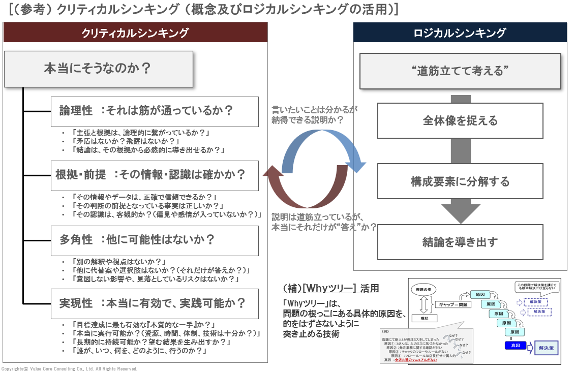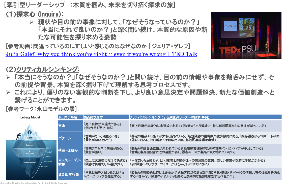 つまり、クリティカルシンキングは、「問い続ける力=探求力」を鍛えるための土台であり、牽引型リーダーが「本質」と「意味」を見抜くための“思考の武器”なのです。*別コラムにて詳細記載予定