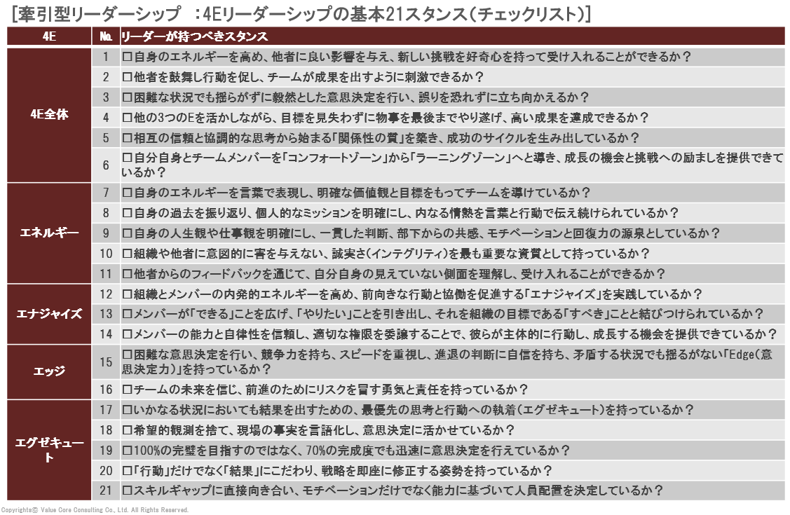 - □他の3つのEを活かしながら、目標を見失わずに物事を最後までやり遂げ、高い成果を達成できるか?