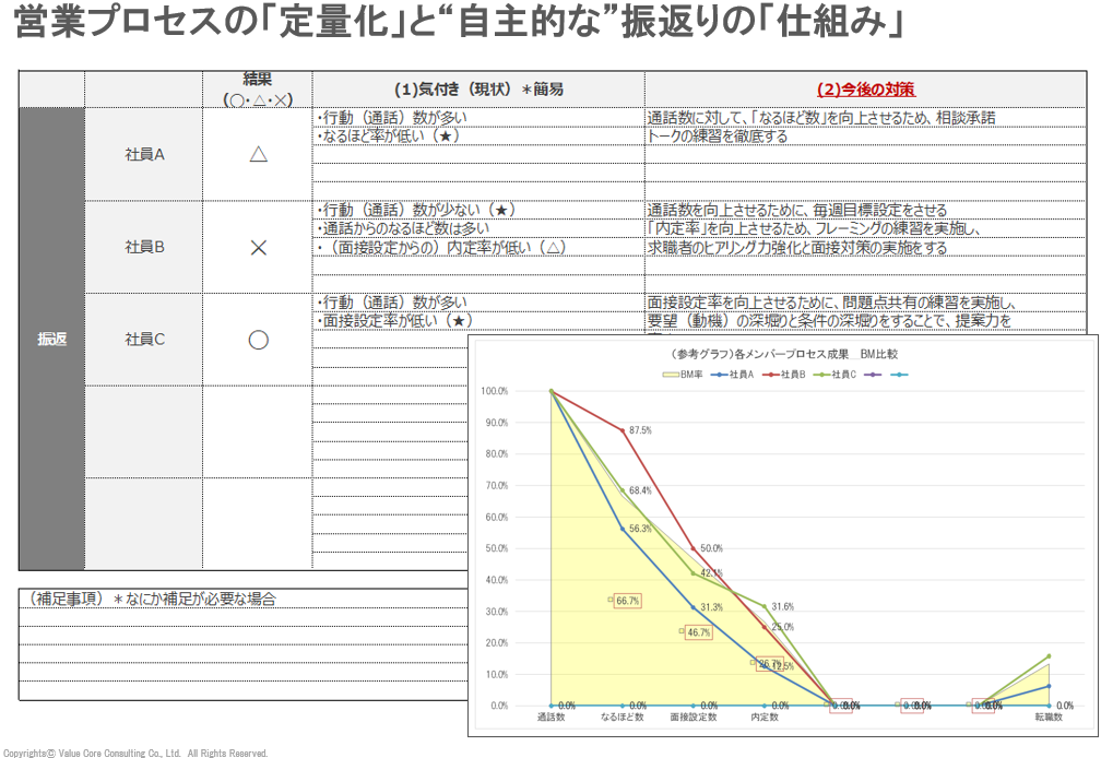 - 定期的なレビューとフィードバックを通じて、プロセスの定着を促し、継続的な改善を図る。