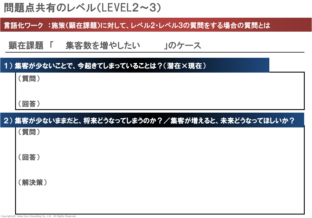- 「仮にこの課題が解決することで、どのような状態になっていたいですか?例えば、若手が辞めない…など」