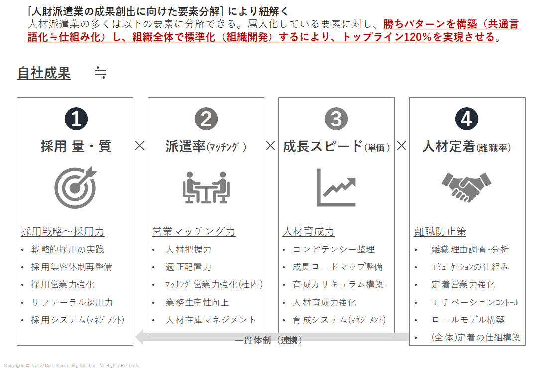 【自社成果】 ≒ 【採用量・質】×【派遣率(マッチング)】×【成長スピード(単価)】×【人材定着(離職率)】