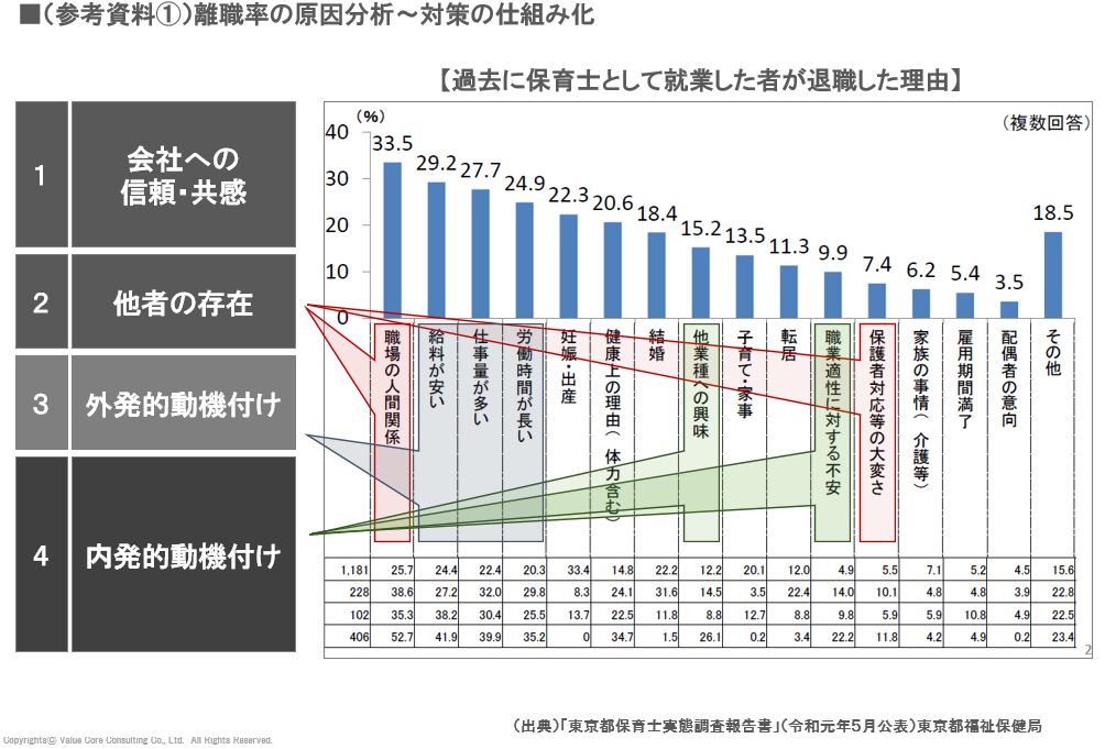 - 職場の人間関係(33.5%) : 最も多くの回答を集めており、「他者の存在」に関する課題が、保育士の離職の大きな要因となっています。