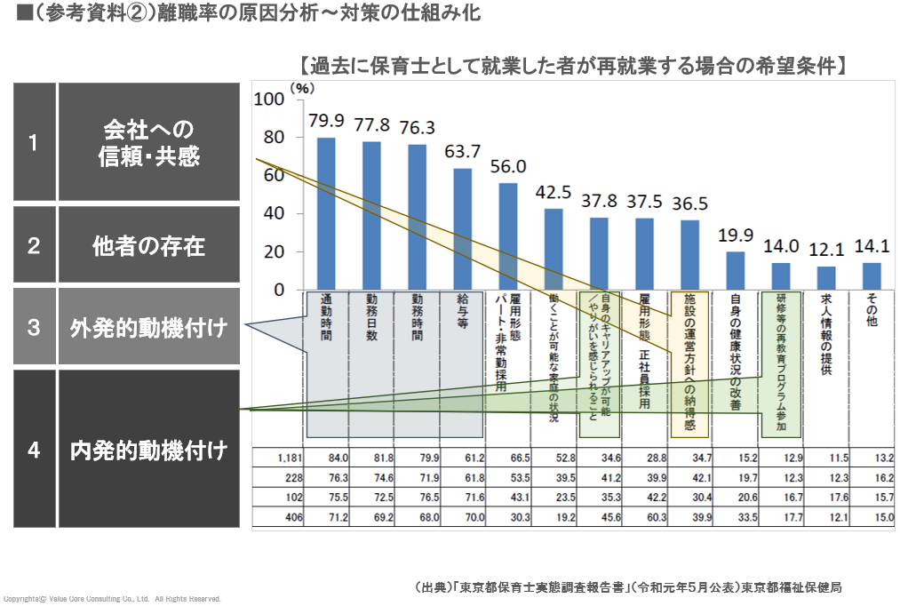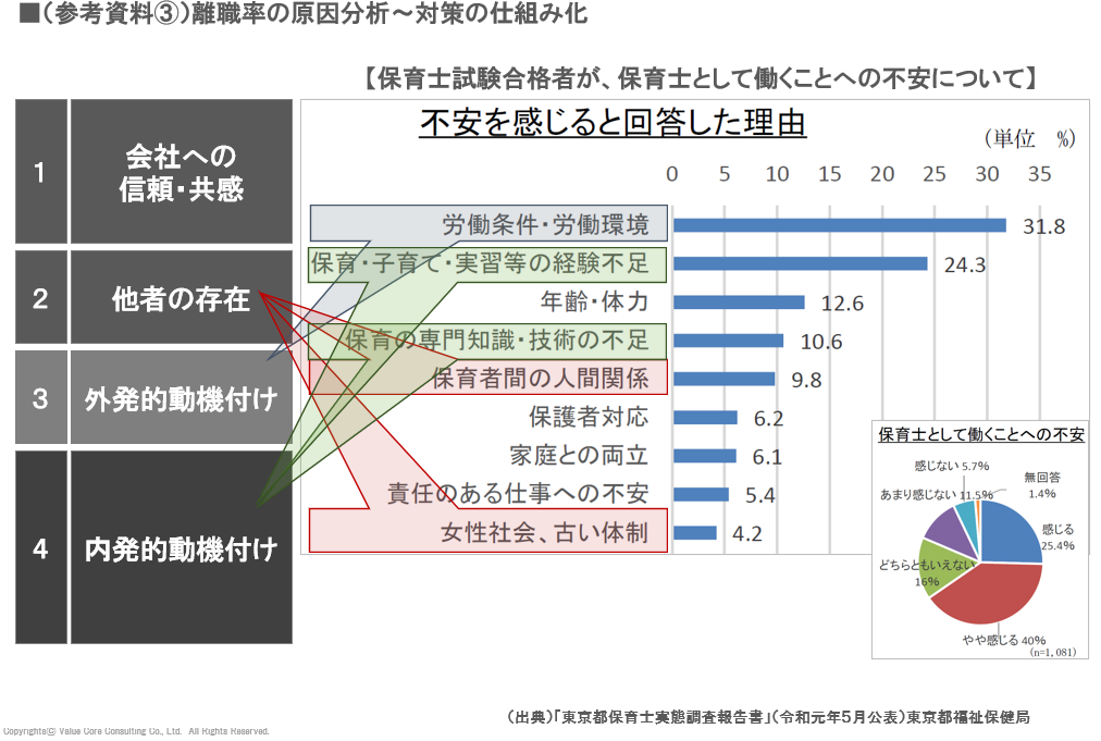 - 健康上の理由(体力含む)(22.3%)、妊娠・出産(20.6%) : 保育士という仕事が身体に負担をかけることや、ライフステージの変化に対応できていない現状が伺えます。これも「外発的動機付け」の改善が必要であることを示しています。