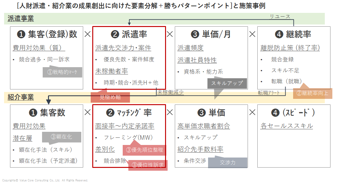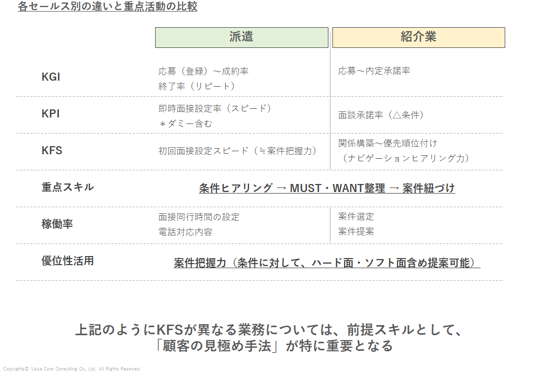 - 派遣事業では、即時面接設定率(スピード)や初回面接設定率(案件把握力)が重視されます。