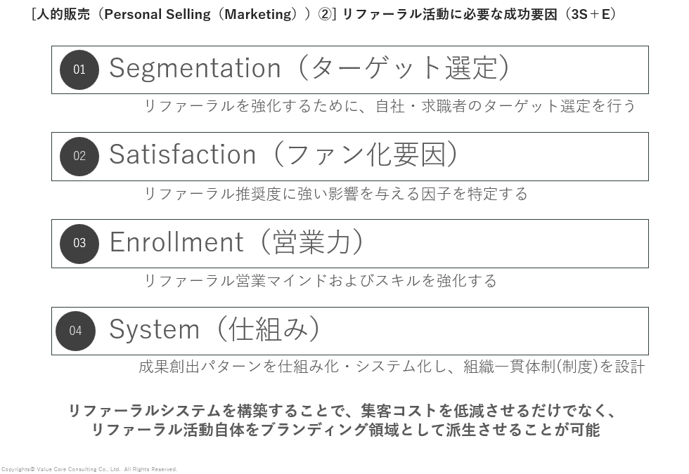- System(仕組み化) : インセンティブ制度やフォロー体制を整備し、紹介が継続する環境を構築します(ツールを含め、リファーラル実行管理を徹底)