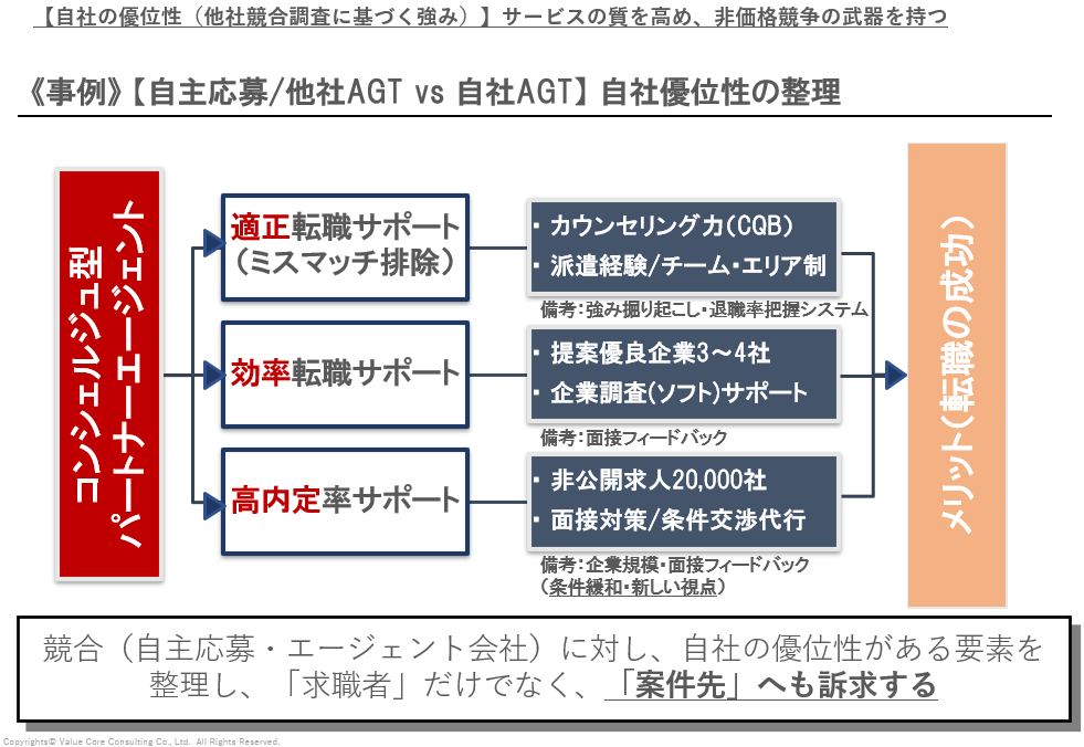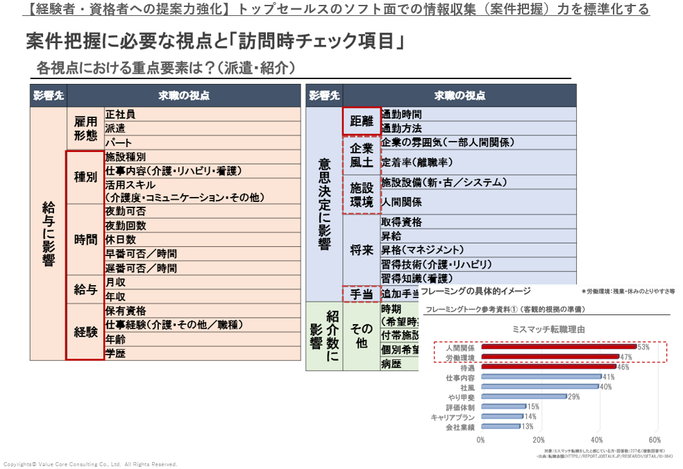 - さらに、現職の問題点(例:不満要素、成長機会の欠如、人間関係の断絶など)や現在の不安への解決事例を情報格差(他の求職者の解決策など)として言語化して共有することで、転職の意義を強く実感できるようになります。
