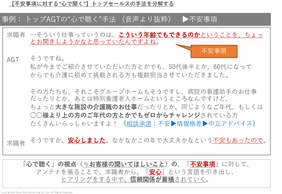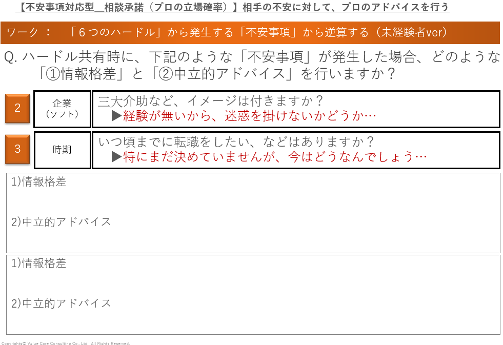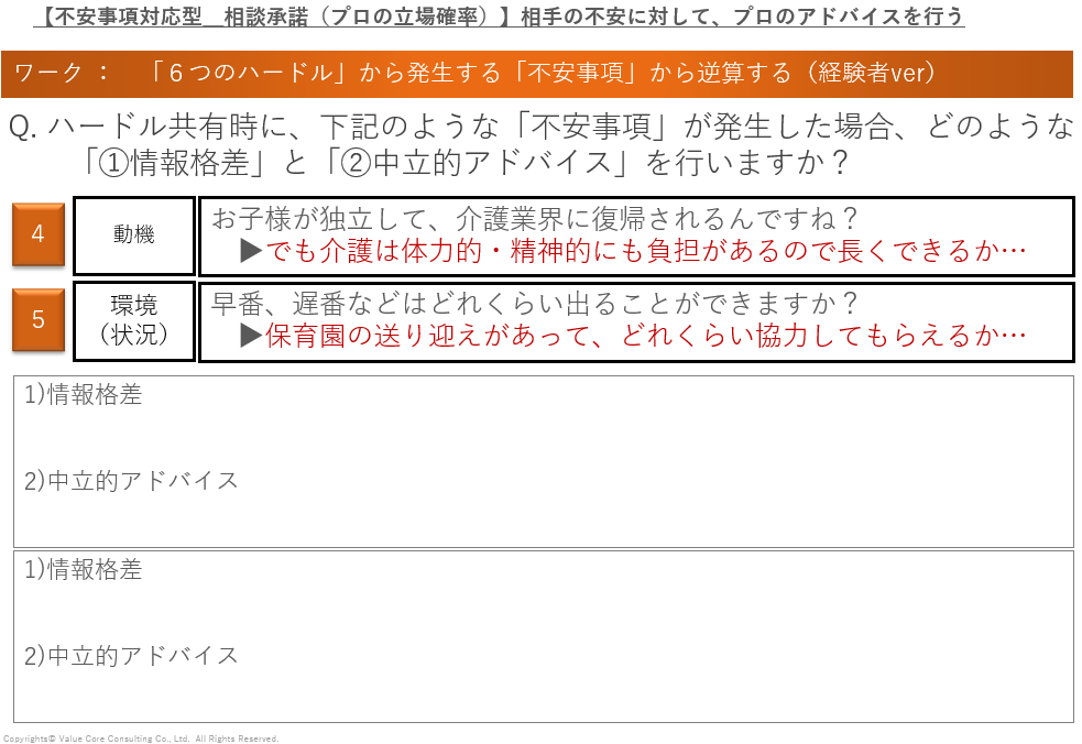 - 相談承諾(プロの立場の確立)のプロセスを通じて、業界や仕事へ、情報格差(相手の知らないことを分かりやすく伝達)により理解促進を行い、可能性に自信を持たせる働きかけが重要です。