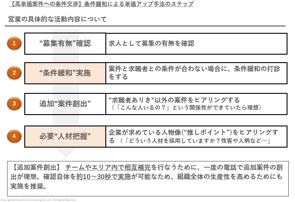 - 「求職者の志向と、企業の採用条件のどこにギャップがあるか」を冷静に整理し、一部緩和や別条件の提示など柔軟な打ち手を講じることで、単価アップに繋がる合意形成が可能となります。