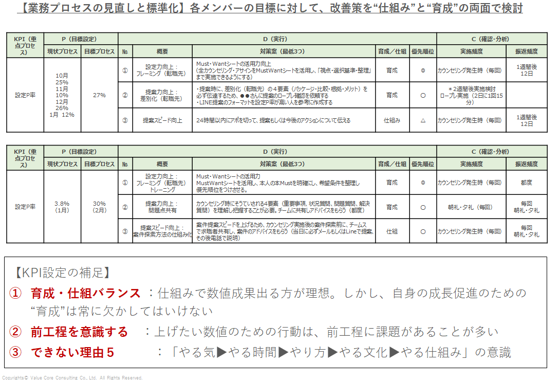 - 現場でPDCAを回す 実際に商談を行った後、チェックリストを使って「課題を3つ以上引き出せたか?」「顧客のキーパーソンに会うための次回アクションを明文化できたか?」といった項目(プロセス)を自己評価し、マネージャーがフィードバックを行う仕組みを導入