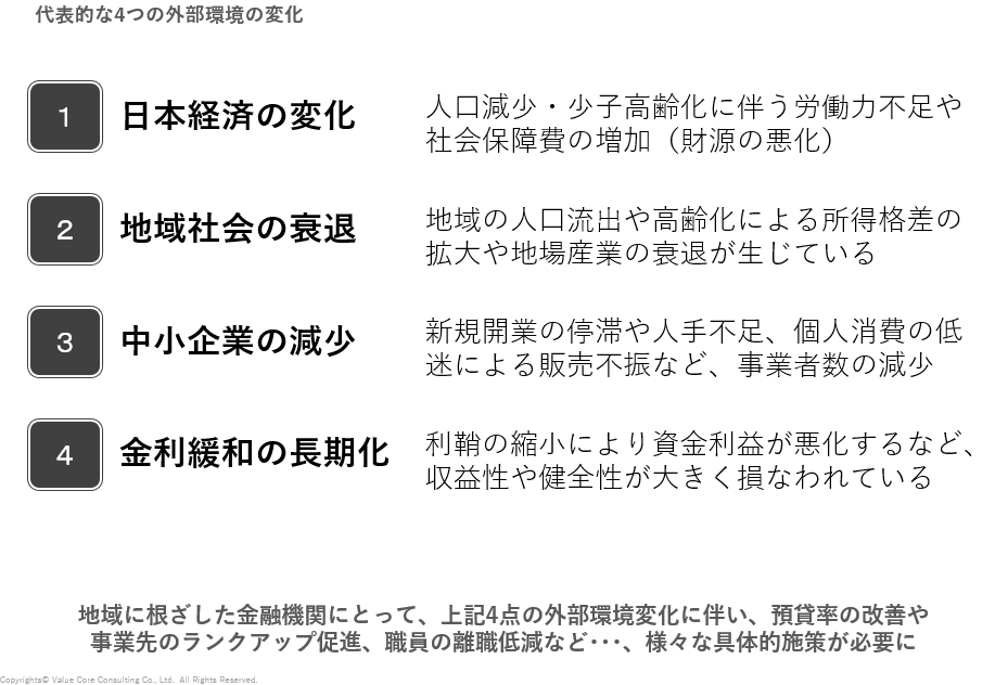 近年、金融機関が直面している外部環境の変化は次の通りです。