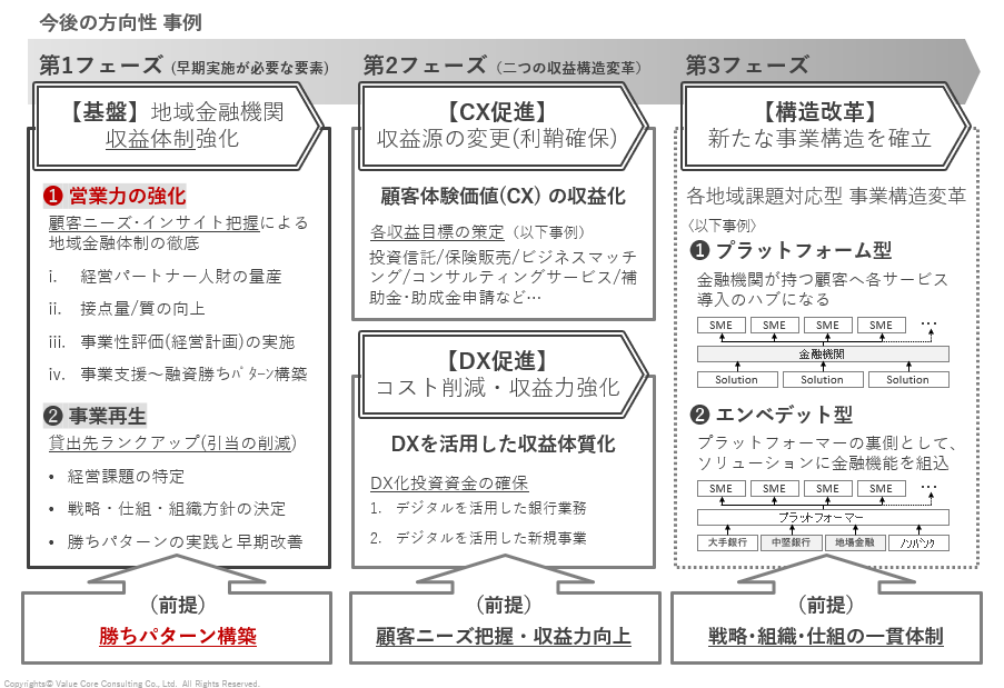 - 課題 : 従来の融資中心モデルから脱却し、役割や立ち位置を大きく変える取り組みです。高度な戦略性と組織全体の変革が不可欠であり、短期的にはコストやリスクを伴いますが、長期的な持続可能性を確保するためには避けて通れない道です。
