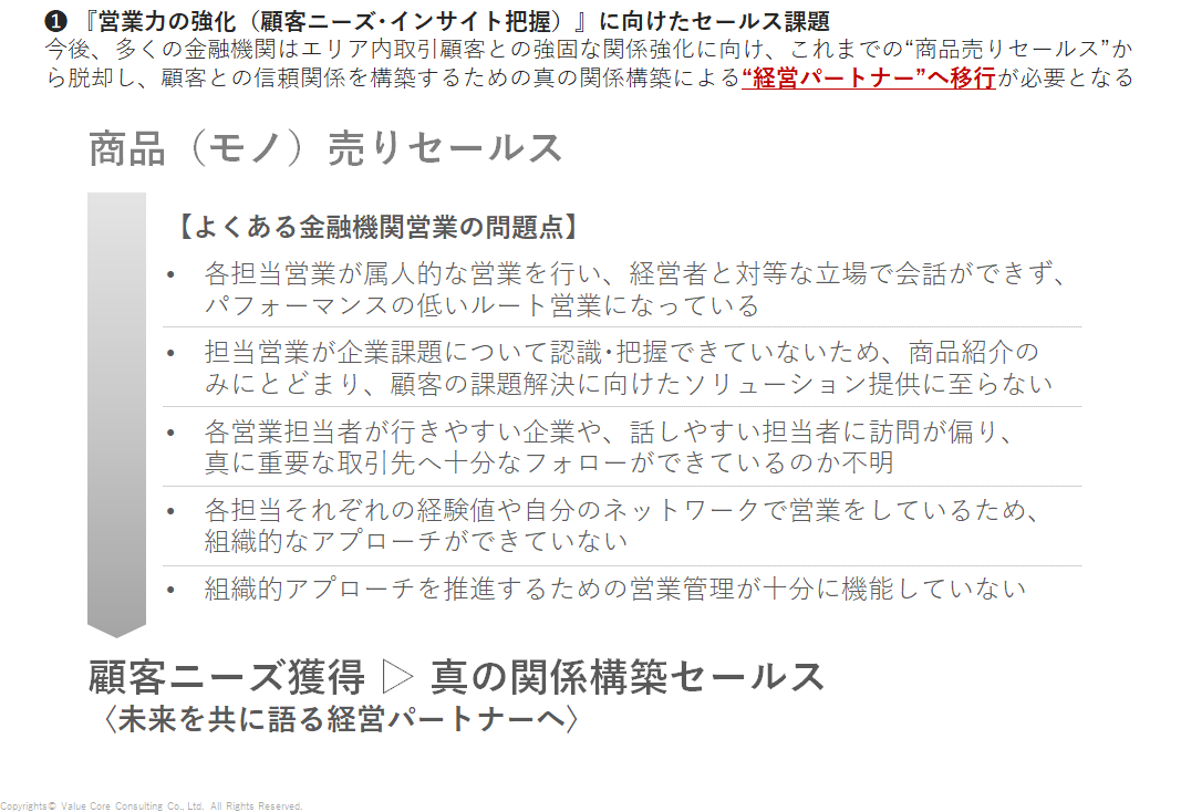 多くの金融機関が直面している課題の解決策は、「営業体制の強化と勝ちパターンの構築」にあります。