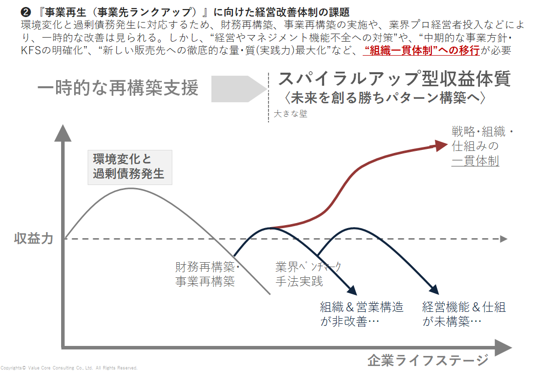 - 重点 : まず「営業力強化」と「事業再生支援」の両面に手を付け、最初の分岐点を乗り越える必要があります。