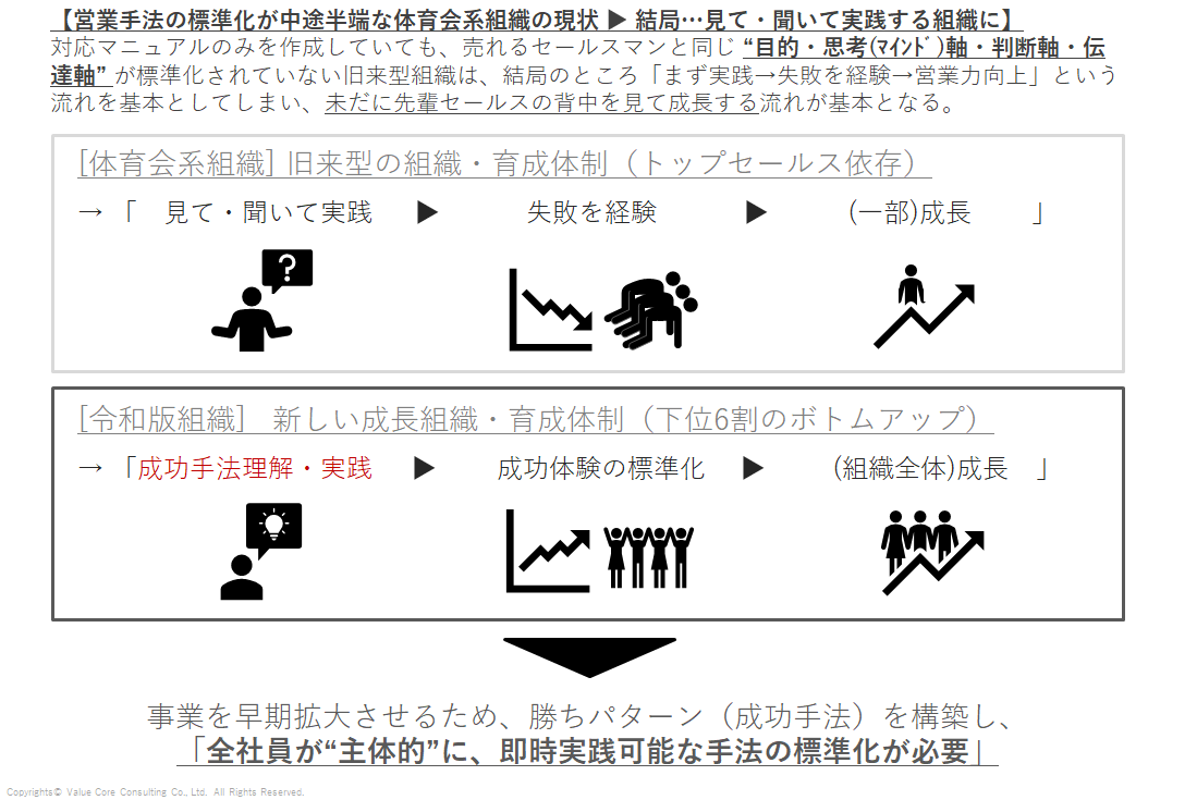 - トップライン・アプローチ: 営業や紹介における「勝ちパターン」の仕組みを構築し、組織全体の営業力底上げを目指します。