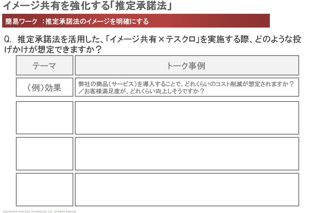 - 「欲」の訴求: 「この設備を導入すれば、貴社の生産性は飛躍的に向上します。未来の成長している状態は想像できそうですか?」