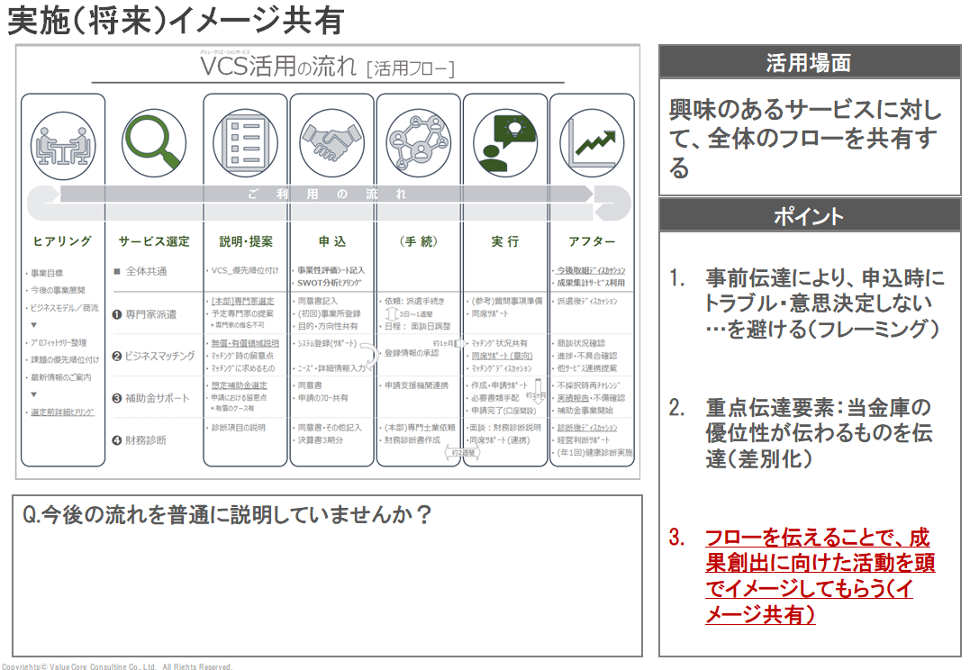 契約から導入、そしてその後の運用までの一連の流れを明確に説明することで、顧客がサービス利用後の具体的な姿を想像できるようにし、購買意欲を高める手法です。