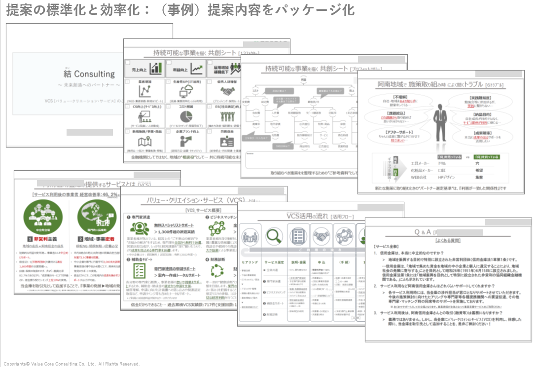 - 概念: 誰でも一定レベルの提案ができるよう、提案内容をパッケージ化します。