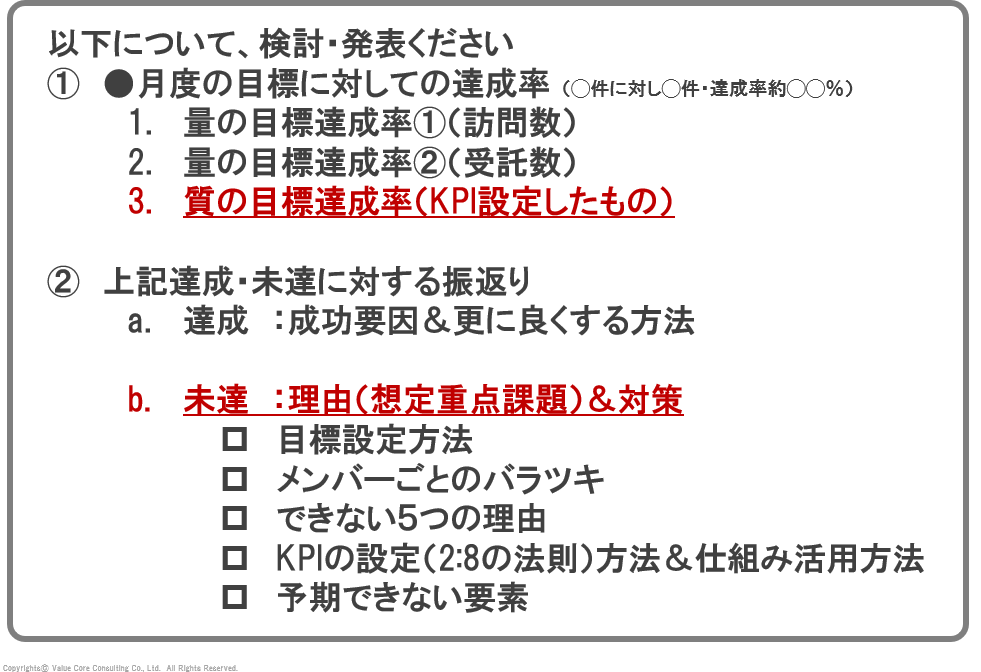 - 概念: メンバー自身に前週の成果と活動を振り返らせ、自ら課題を認識する力を養います。