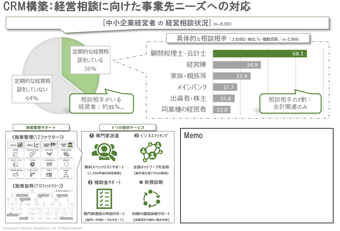 弊社(株式会社バリュー・コア・コンサルティング)では、以下5つのサービスを提供しております。