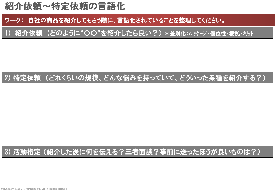 - 紹介依頼トークスクリプト: 顧客にスムーズに依頼を切り出すための会話例や、具体的な人物像を提示する「特定依頼(こんな人いませんか?)」のリストなど、すぐに使える型を用意します。