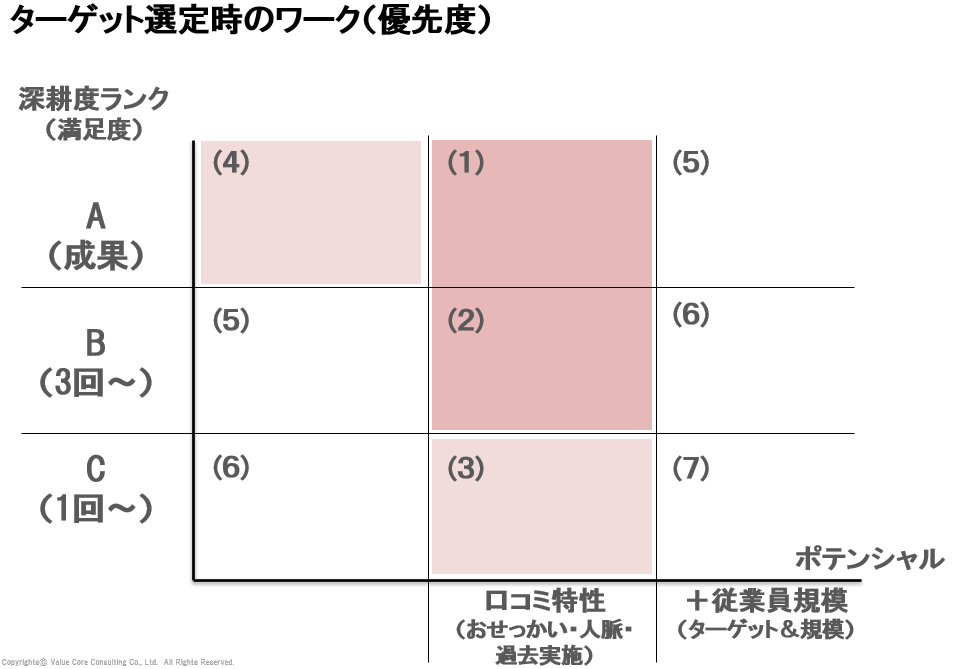 概念:紹介意向や満足度、影響力といった基準で顧客を分類し、紹介を依頼すべきターゲットを明確化します。