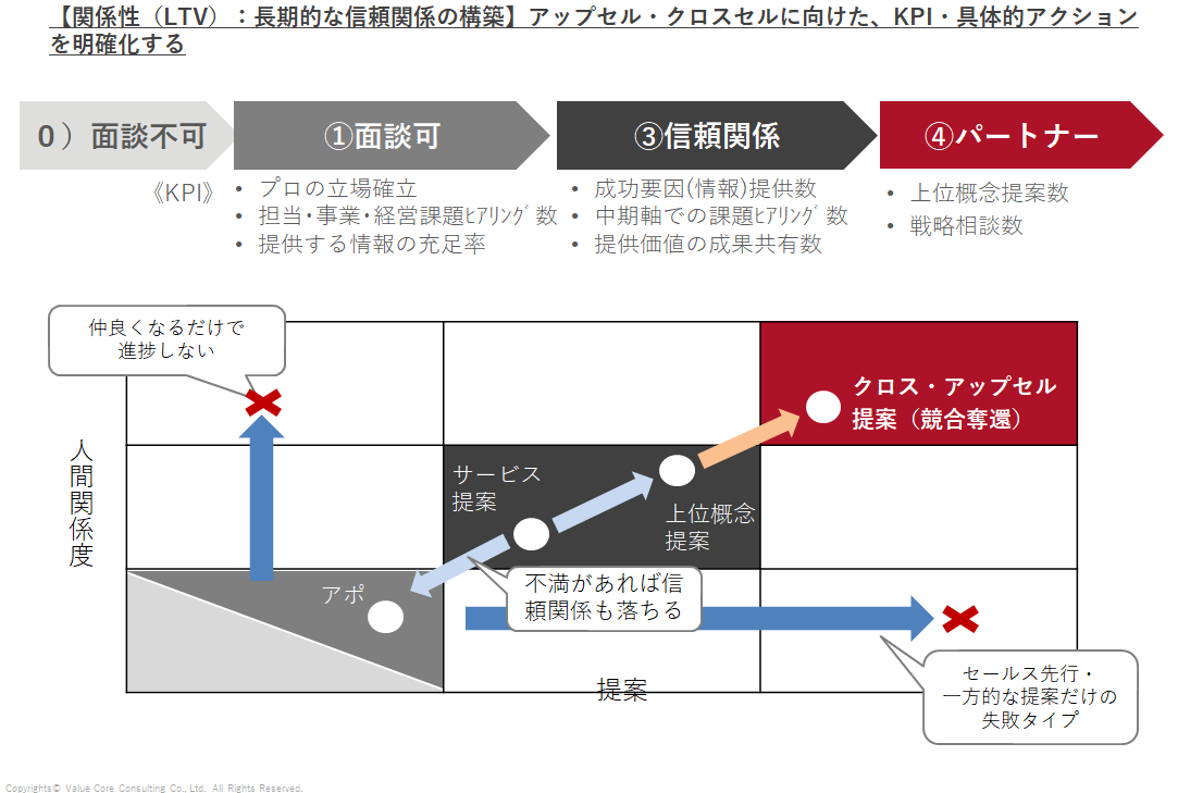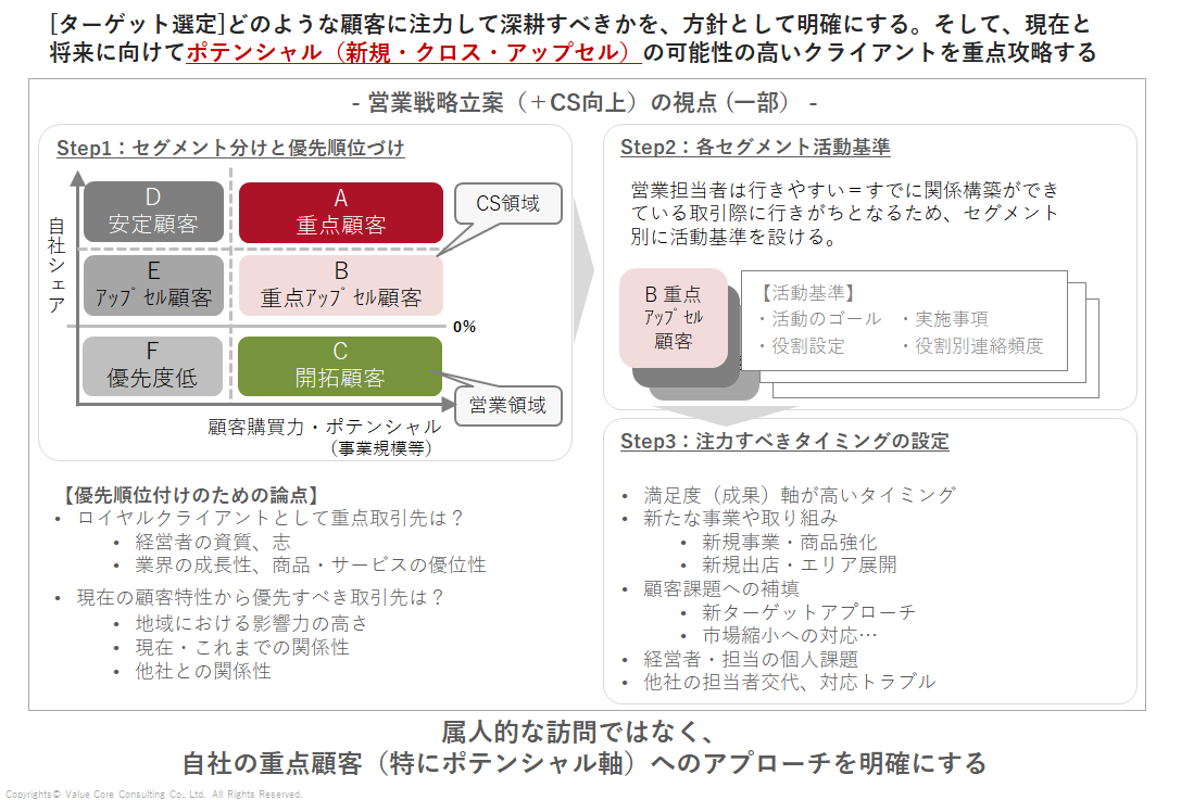 顧客セグメントごとに、具体的な活動基準を定義し、訪問頻度・ゴール設定・役割分担を明確にすることが不可欠です。これにより、中長期的な視点で顧客との関係性を確実に深めることができます。