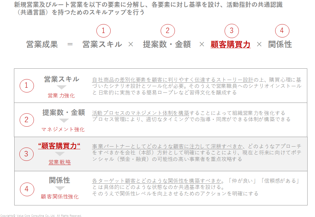すでに各IT・システム企業内で活用している要素に付随させ、このフレームワークを導入することで、営業活動の目的が明確化され、経営資源の配分が透明化されます。
