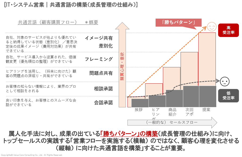 営業活動全体を「顧客心理を変化させる」ように捉え、競合ではなく「自社への購買意欲を高める」能力が、トップセールスマンとのギャップとなるケースが増えています。