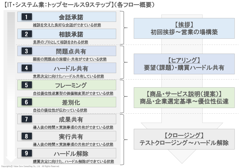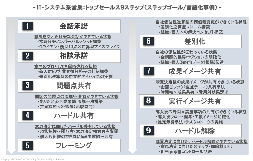 この9ステップにおいて、具体的に何を行うのかを標準化し、全員が共通の言語で営業を進められるようにすることが、成果の再現性を高めるポイントです。