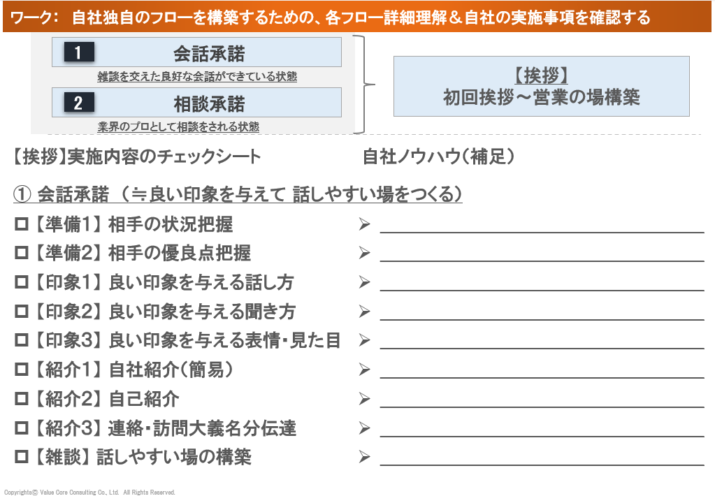 - 会話承諾 : 雑談を交え、良好な会話ができる状態をつくる。