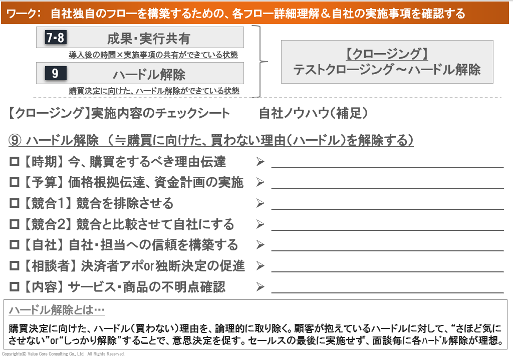 - ハードル共有 : 意思決定に向けた障害や懸念点を顧客と共に明確化する。