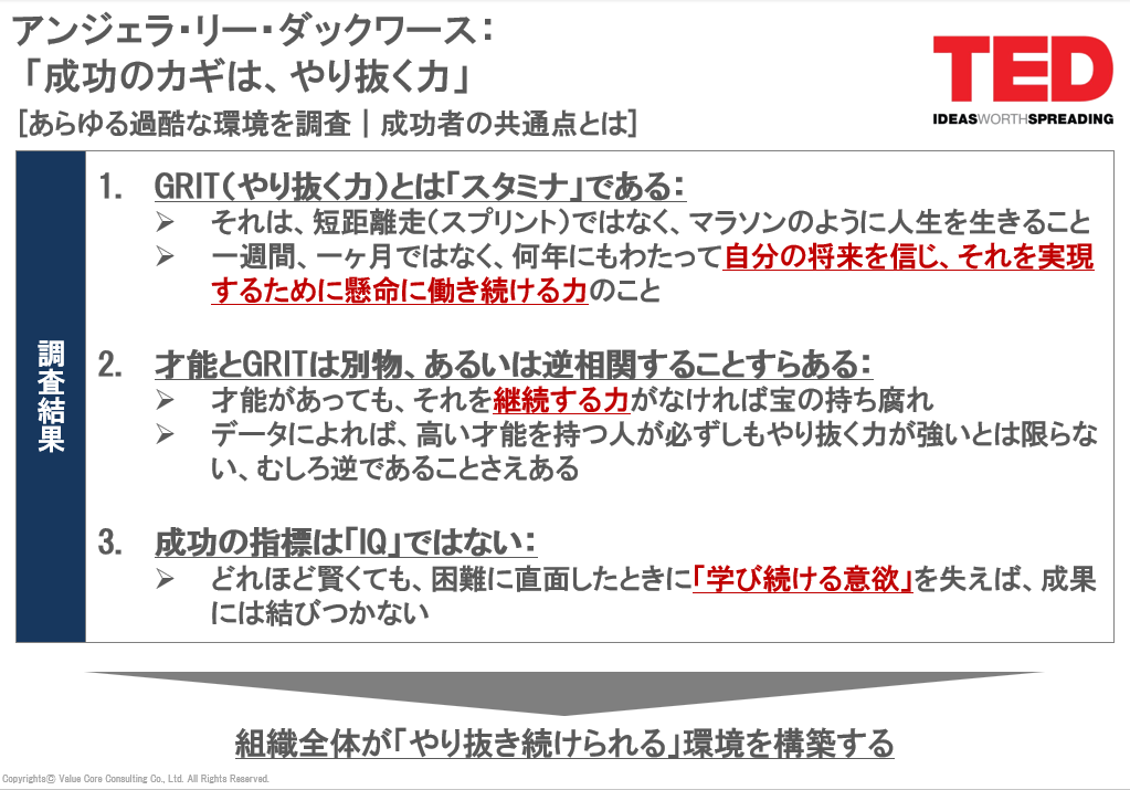 アンジェラ・リー・ダックワース氏の知見をベースに、個人の才能を「確かな成果」へと変えるための「やり抜く組織」への変革をサポートしています。