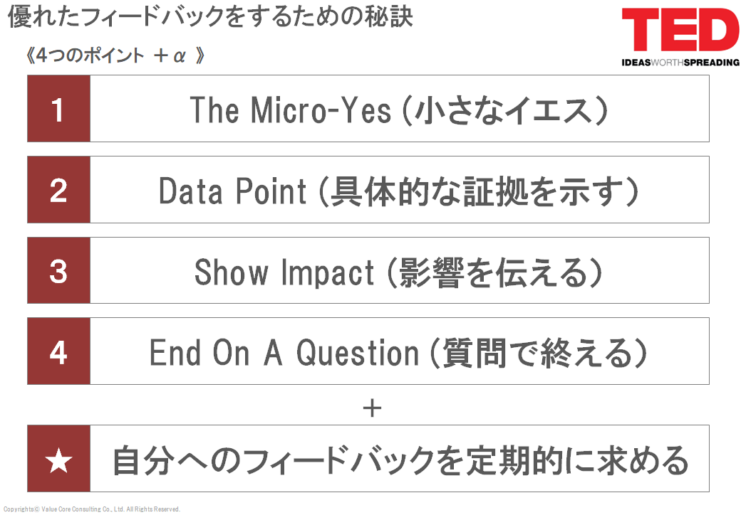 - これにより相手から「はい」という回答を受け、フィードバックの受け入れ体制を整えます。