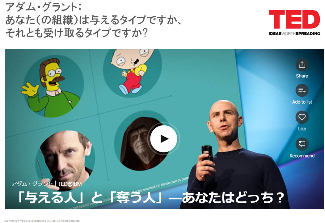 【参考動画】 アダム・グラント:あなた(の組織)は与えるタイプですか、それとも受け取るタイプですか?