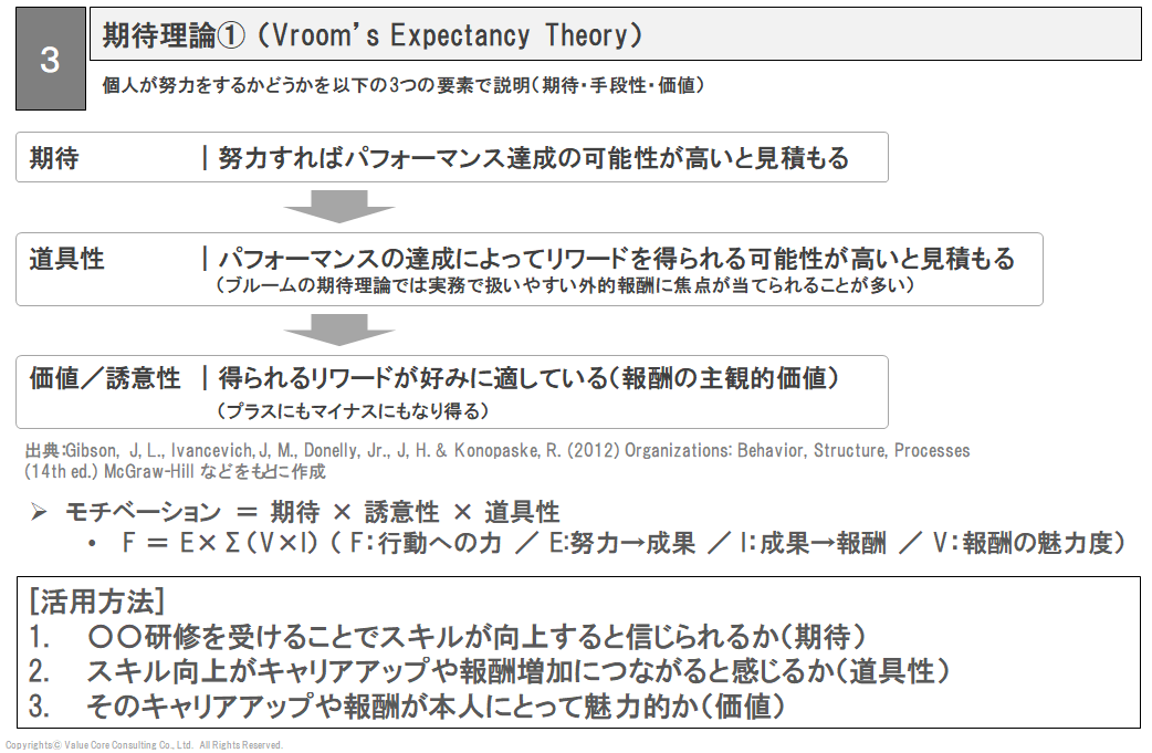 心理学者ビクター・ブルームが提唱した「期待理論」は、人のモチベーションを以下の3つの要素の掛け算で説明しています。