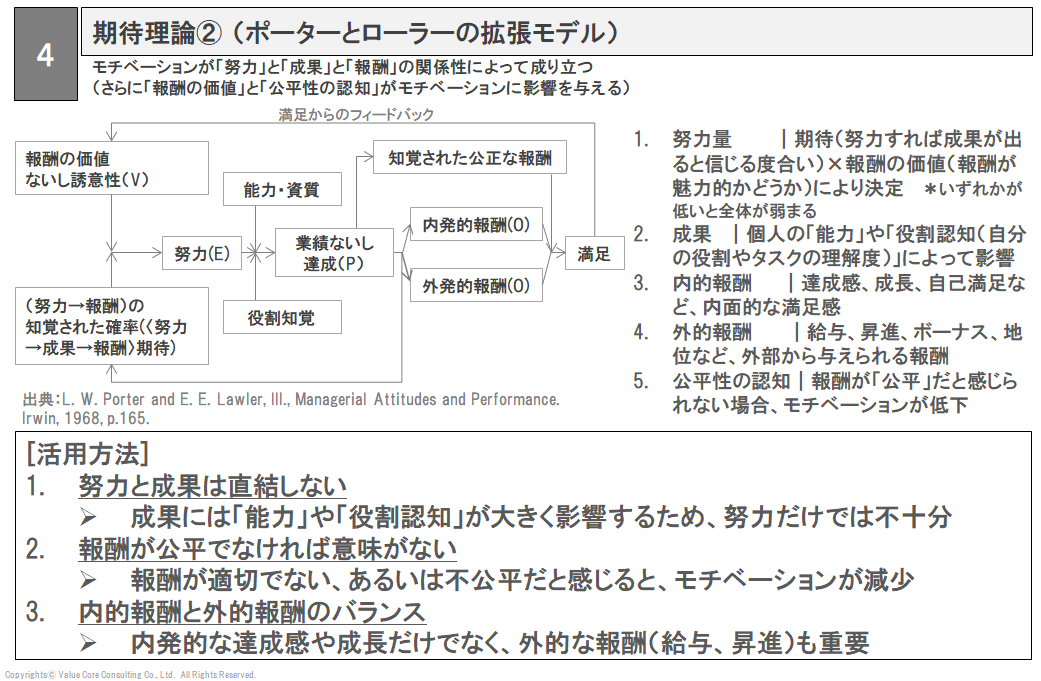 多くの経営者や管理職を悩ませるこれらの問いに対し、ポーターとローラーが提唱した「期待理論の拡張モデル」は、努力が成果(業績)になり、それが満足へと繋がるプロセスを以下の5つのチェックポイントで整理しています。