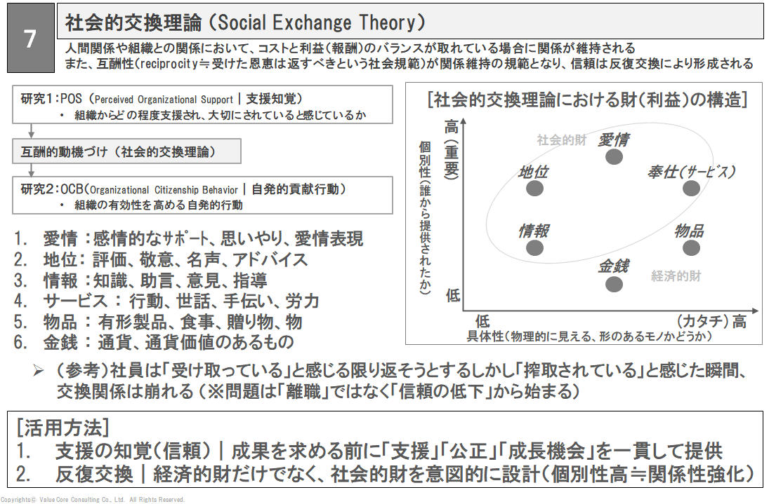 株式会社バリュー・コア・コンサルティングでは、社会的交換理論に基づき、貴社の「目に見えない交換関係」を可視化します。