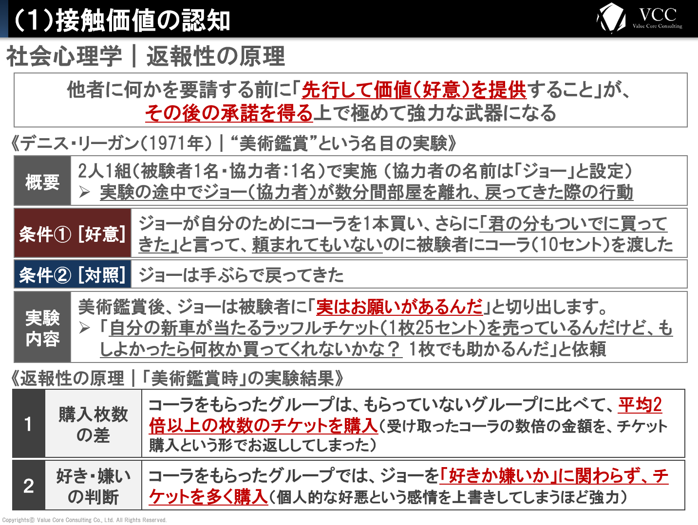 - 「好き・嫌い」を超える影響力:通常、人は「好きな人」から物を買います。しかし、コーラを贈られたグループでは、ジョーを「嫌い」と評価した人でさえ、コーラをもらっていない「好き」な人よりも多くのチケットを購入しました。