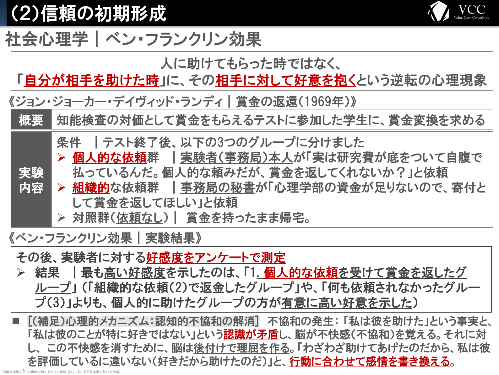 なぜ、損(返金)をしたはずの被験者が、相手を好きになるのでしょうか?これは心理学者レオン・フェスティンガーの「認知的不協和の解消」で説明されます。