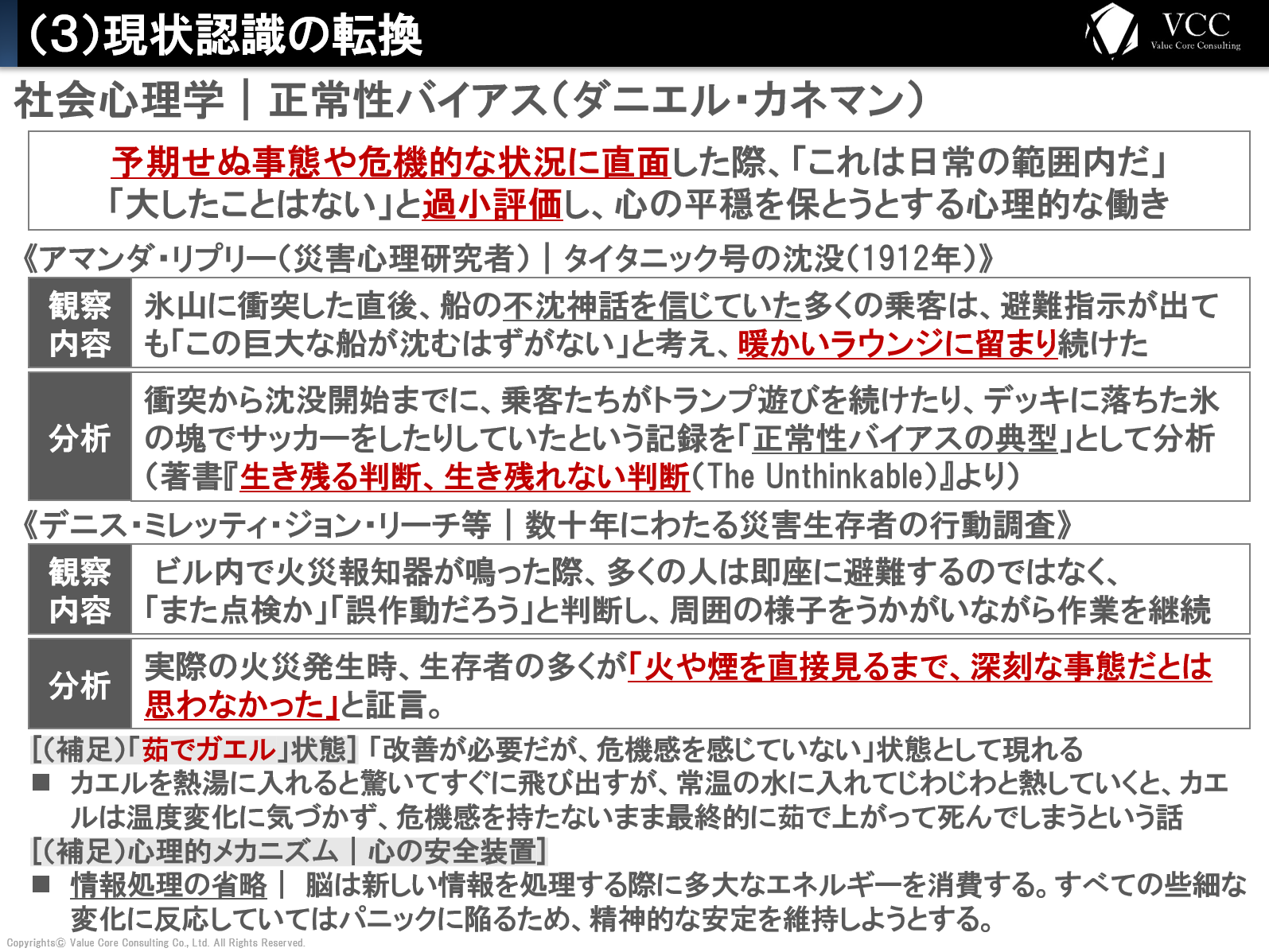 - 「外部の警告者」としての役割:組織内部では正常性バイアスが伝染し、集団で「大丈夫だ」と思い込む傾向(集団思考)があります。外部の専門家であるあなたが「客観的な危機」を告げることで、顧客は初めて現状を客観視できるようになります。