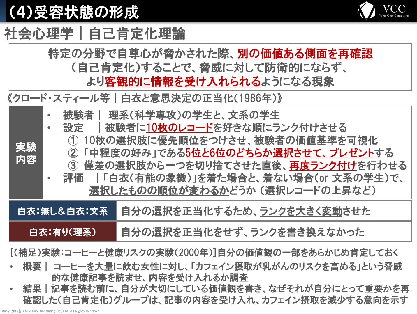 - 結果:白衣を着ていない学生や文系学生は強く自己正当化しましたが、白衣を着た理系学生だけは、正当化する必要を感じませんでした。