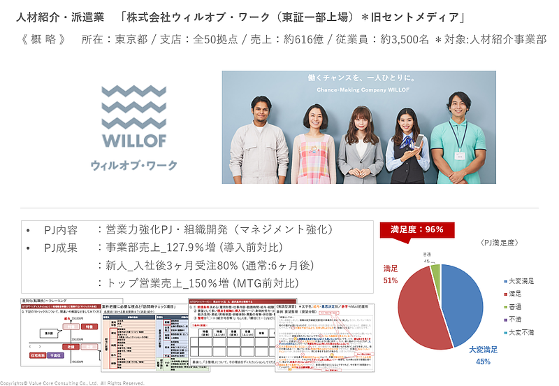 こうした業界特有の課題に対し、ウィルオブ・ワーク様では、研修わずか3ヶ月で新人の80%が初受注、トップ営業は売上150%増を達成しました。