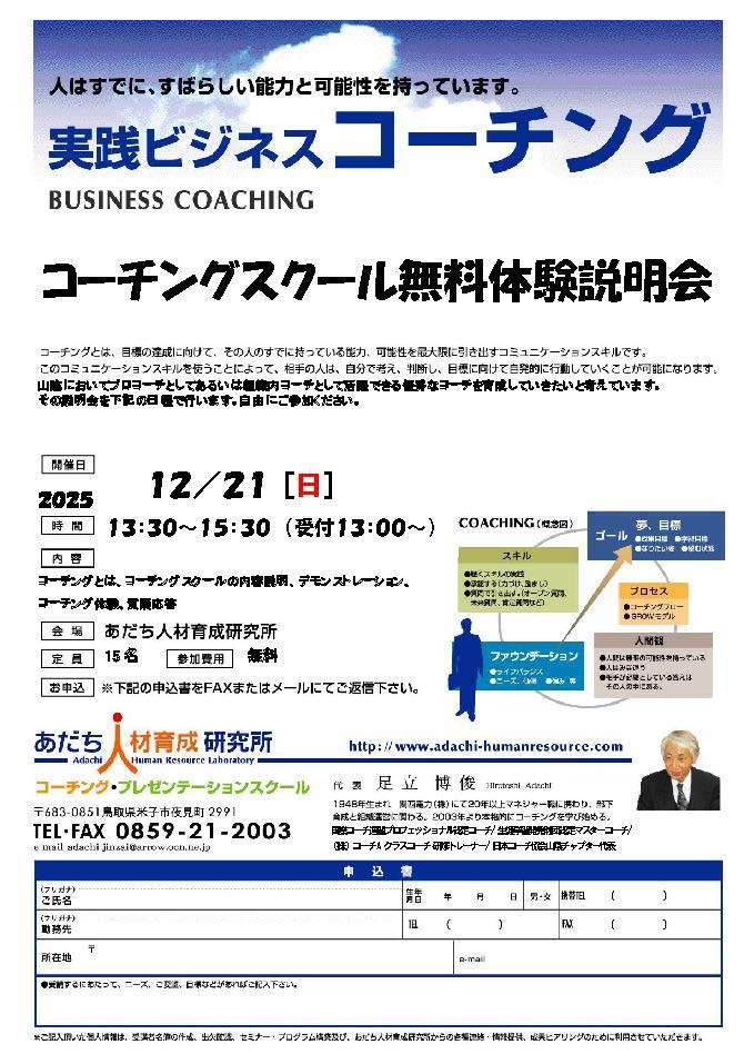 山陰においてプロコーチとして、あるいは、組織内コーチとして活躍できる優秀なコーチを育成していきたいと考えています。
