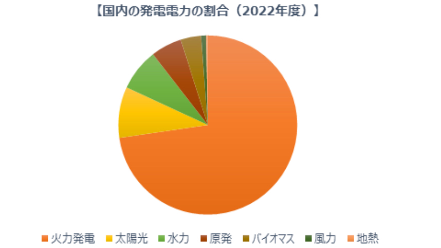2022年度の国内の発電電力の割合を調べてみると、化石燃料による発電(火力発電)が70%以上を占めており、次いで太陽光(9.2%)、水力(7.6%)、原発(5.6%)、バイオマス(3.7%)、風力(0.9%)、地熱(0.3%)という順になっていることが分かりました。