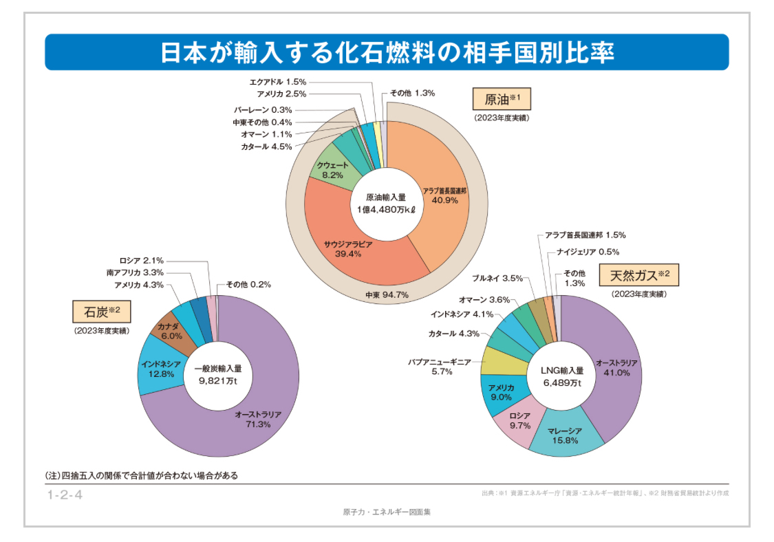 特に私たちの生活に身近な石油はと言うと、中東諸国が大半を占めている事がわかり、日本はエネルギー資源のほとんどを海外からの輸入に頼っている事がお分かりかと思います。