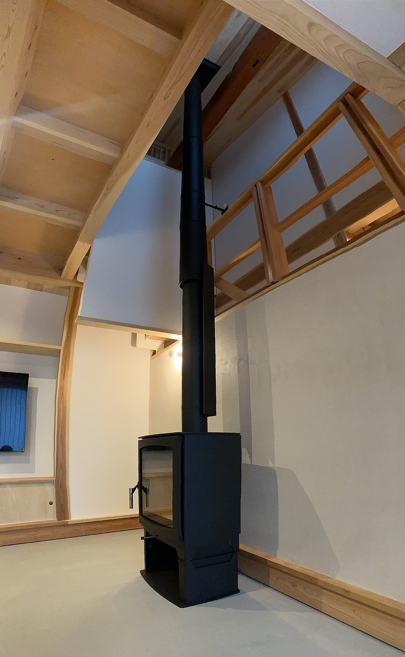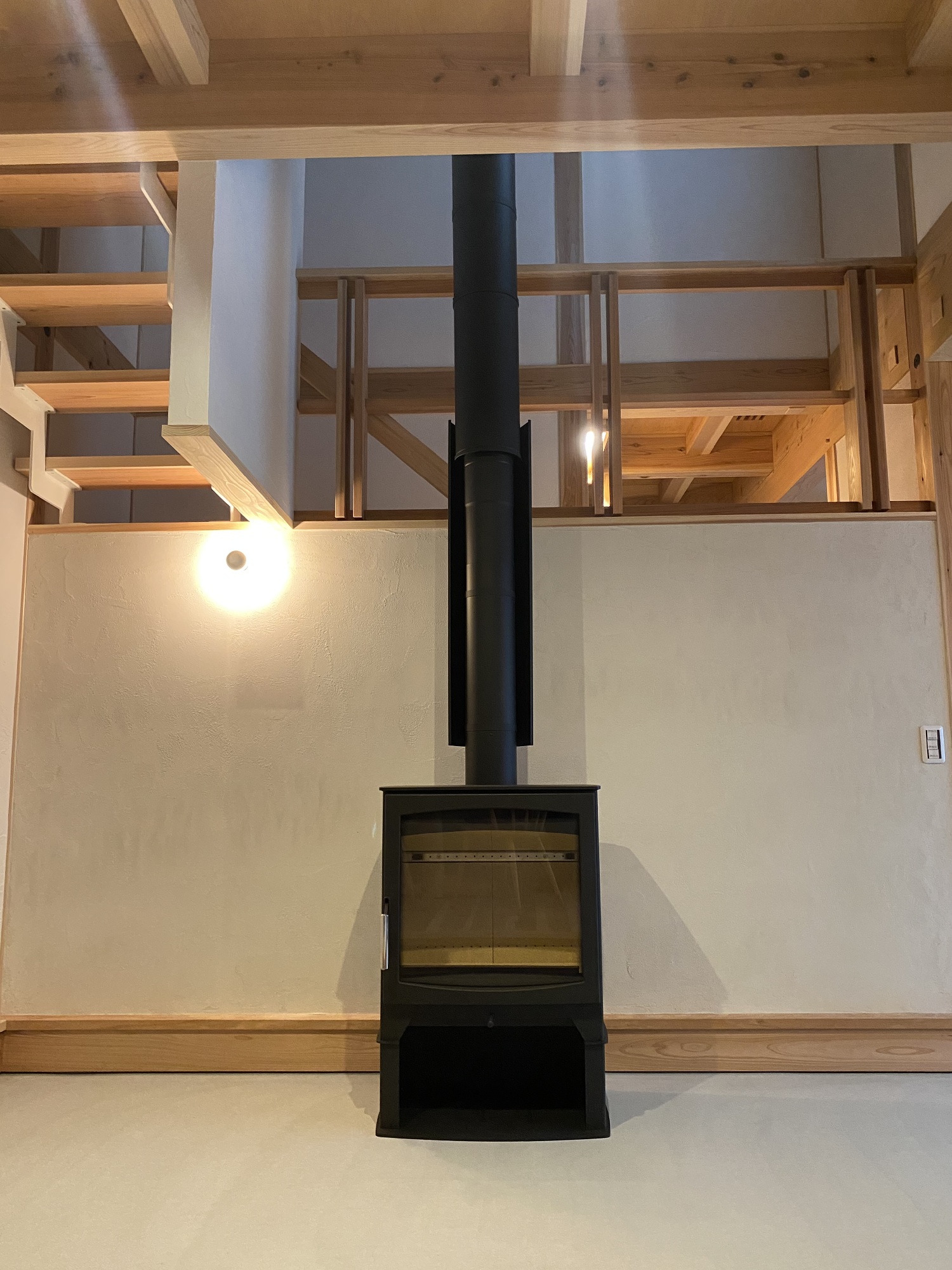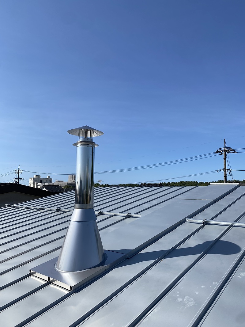 外部煙突は、主張しすぎず建物にもマッチする無塗装煙突を使用し、排気・メンテ性の良い陣笠トップ