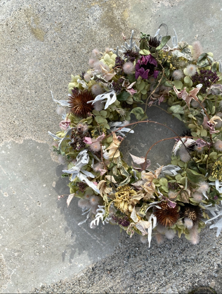 リースを作れるようにきれいにストックしておいたドライフラワー。色が出るもの無彩色なものいろいろチョイスして繊細なリースに。