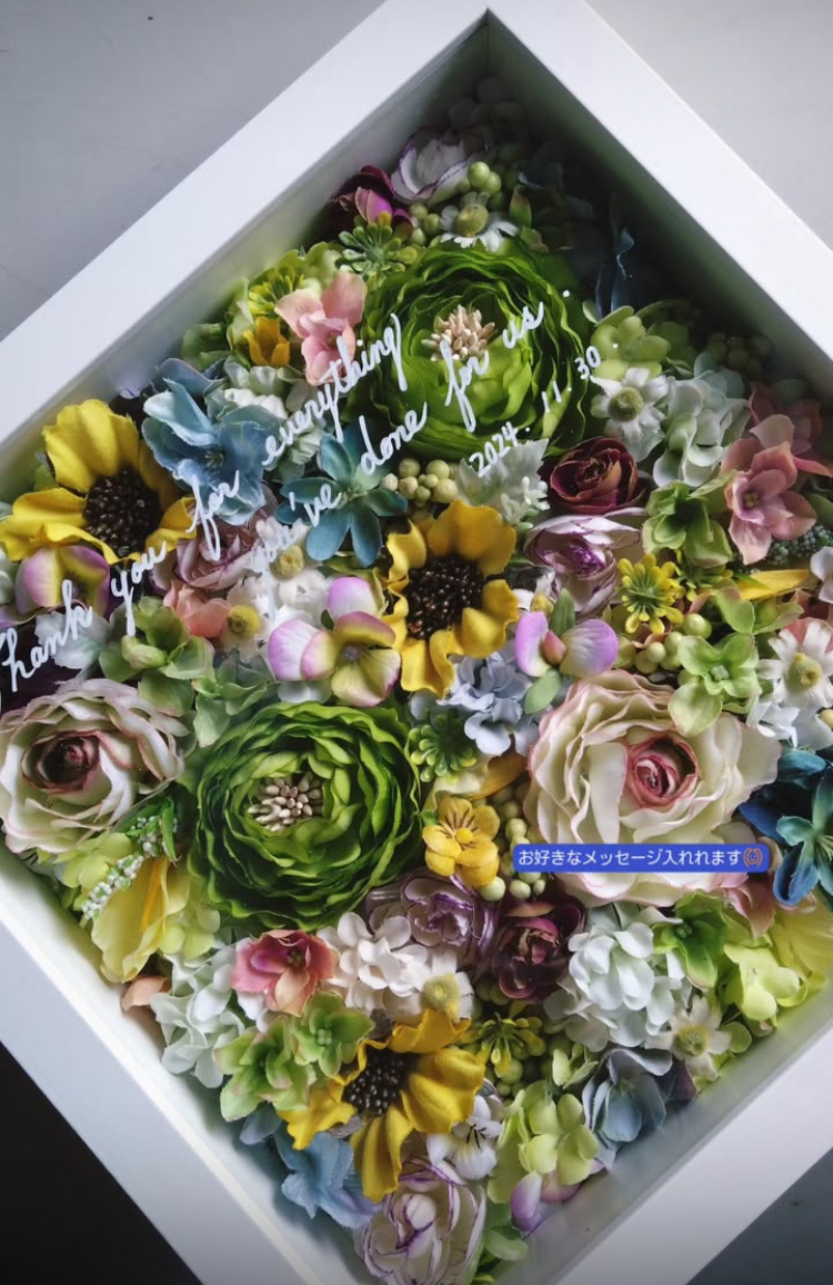 贈り物本体にメッセージを書き添えるかたち。お世話になった方へお花をたっぷり詰め込んだフレームに伝えたいメッセージも添えて。