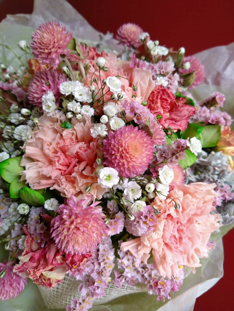 柔らかな春色でドライになったお花たちを集めて、小さなブーケを作ってプレゼント!本当にミニミニですが、かわいさはビッグ!